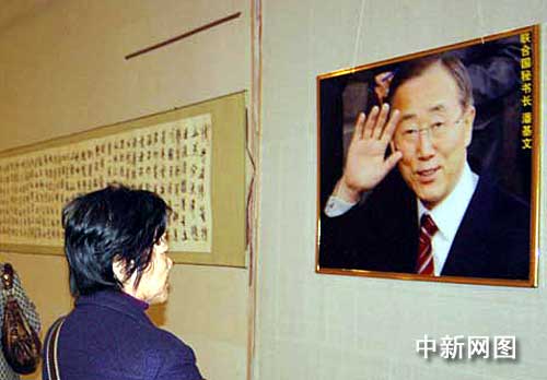 中新網南寧1月11日電(記者 劉萬強)聯合國秘書長潘基文“亮相”中國廣西博物館正在舉行的2009年潘氏迎春書畫藝術作品展上,在該項展覽中,潘基文作為潘氏名人,他的兩幅照片被掛在展廳內的顯著位置。