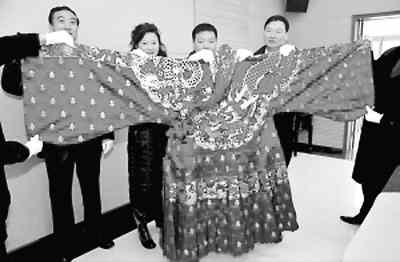 這件龍袍復制前后用了3年,僅畫稿階段就用了一年時間,共畫了9幅設計稿。接著構思設計用了8個月,挑花用了8個月,裝機3個月,最后織造用了5個月。為了避免失誤,在龍袍面料上機前,對每一個局部還要進行輔機試樣。為了忠實于歷史原貌,此次龍袍的面料制作,采用的是明代67厘米寬的織機。據介紹,這件龍袍屬云錦中最高級別“妝花”,關鍵工藝就是挑花結本,要求必須是按照傳統工藝手工完成。挑花要求很高,過去一般挑花要求是100根,而這件龍袍必須達到1800根,龍袍門幅排兩面,各分900根,再拼接在一起,一根也不能錯。整件龍袍復制從織造到縫制完全以手工完成,材料珍貴,工量巨大,極其費時費工,但比明代制作這件龍袍節省了10年時間。