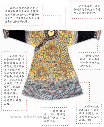 “錦衣玉食”常被用來形容奢華的生活狀態(tài),而在中國傳統(tǒng)的各種服飾中宮廷帝王穿著的龍袍算得上是頂級華服了。昨天,包括乾隆、嘉慶、光緒皇帝龍袍在內(nèi)的30件清宮服飾在北京港澳中心舉行的北緯拍賣預(yù)展現(xiàn)場亮相。