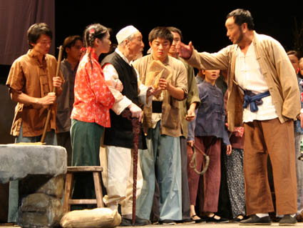 2005年9月6日至8日,由中國(guó)文聯(lián)主辦的紀(jì)念中國(guó)人民抗日戰(zhàn)爭(zhēng)暨世界反法西斯戰(zhàn)爭(zhēng)勝利60周年優(yōu)秀劇目展演抗戰(zhàn)獨(dú)幕劇專場(chǎng)在中央戲劇學(xué)院實(shí)驗(yàn)劇場(chǎng)上演。91歲高齡的山尊老不僅擔(dān)任專場(chǎng)演出的總策劃,還在《求雨》中扮演一個(gè)回族老人宋大爺,這個(gè)形象設(shè)計(jì)是為了表現(xiàn)全國(guó)各族人民團(tuán)結(jié)一致抗戰(zhàn)的決心。由于老人家年事已高,而在劇中還有一個(gè)磕頭的場(chǎng)面,因此在人物設(shè)計(jì)上,將由一個(gè)“小孫女”攙扶上場(chǎng)。當(dāng)大家關(guān)心他是否一定要出演這個(gè)動(dòng)作時(shí),老人說(shuō):“磕頭這個(gè)場(chǎng)面我一定要演,而且可以演,但是在起身的時(shí)候,可能要人扶一把。”他的敬業(yè)精神感動(dòng)了所有年輕的演員。本報(bào)組織員工專門(mén)到劇場(chǎng)觀看了這場(chǎng)演出,山尊老對(duì)藝術(shù)的執(zhí)著精神和要牢記歷史、珍愛(ài)和平的諄諄教導(dǎo)讓大家非常感動(dòng)。演出結(jié)束后,報(bào)社向山尊老敬獻(xiàn)了花籃,祝福老人家健康長(zhǎng)壽、藝術(shù)生命長(zhǎng)青。山尊老欣然與大家合影留念,并高興地說(shuō),謝謝報(bào)社對(duì)我的關(guān)心,謝謝你們!