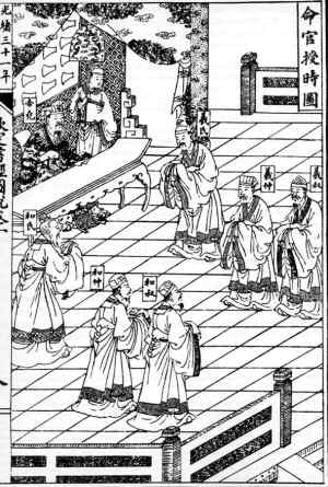 制定歷法,就是“觀象授時”,對統治者來說是最重要的事情。天文歷法象征著帝王“君權神授”的統治權威。傳說堯帝就命天文學家羲、和二氏進行天文觀測以制定歷法。《尚書·堯典》說:“乃命羲和,欽若昊天,歷象日月星辰。”當時是以觀測日出方位和黃昏時中天的恒星來確定季節。根據書中記錄的“中星”天象,可以推斷堯帝“觀象授時”的年代約在公元前23世紀。當時制定的歷法是一年有366天,以置閏月的方法保持與季節同步。