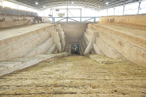 墓地占地面積約800平方米,通過(guò)一個(gè)39.5米的斜坡墓道,直接通到墓室門口,距離地面15米。如果有一座建筑的話,墓地就位于該建筑的地下五層。
