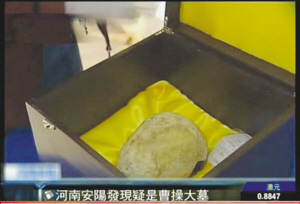 墓地被認(rèn)定為曹操墓,與盜墓賊偷盜的兩件文物有關(guān)。“曹操墓”所在地,原為一窯場(chǎng)取土點(diǎn),被挖掘五六米深后遭到廢棄,有村民在此種上了莊稼。2005年底,一村民在此澆地時(shí),發(fā)現(xiàn)有一處地方水一直向下流,經(jīng)查看發(fā)現(xiàn)那里有一個(gè)洞,推測(cè)下面可能是古墓;過(guò)春節(jié)時(shí),有人發(fā)現(xiàn)該墓已經(jīng)被盜,陸續(xù)被盜得很嚴(yán)重。當(dāng)?shù)嘏沙鏊群笞チ?批盜墓賊,38人。2008年,安陽(yáng)縣安豐鄉(xiāng)派出所從盜墓賊手中繳獲三塊墓內(nèi)畫(huà)像石,畫(huà)像石上部有“主簿車”、“咸陽(yáng)令”、“紀(jì)梁”、“侍郎”等字樣,其下部為水陸攻戰(zhàn)圖場(chǎng)面。從畫(huà)像石的銘文來(lái)看,墓葬規(guī)格相當(dāng)高,應(yīng)該為漢魏時(shí)期的高級(jí)貴族墓葬。在這些文物中,最珍貴的莫過(guò)于石枕與刻銘石牌了。石枕上刻有“魏武王御用”字樣,刻銘石牌上也有“魏武王”字樣。刻有“魏武王”的石牌再次撥開(kāi)曹操墓的迷霧。因?yàn)檫@和曹操的身份相符合:曹操生前為王,他兒子曹丕做了皇帝以后,他才被追封為魏武帝;這兩處的“魏武王”完全與他死時(shí)的身份相符。