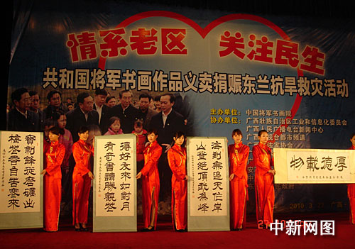 中新網南寧3月27日電(記者 羅先彬)2009年8月份以來,廣西革命老區東蘭縣境內持續干旱,人畜飲水困難,農業生產受影響嚴重。東蘭縣嚴重的旱情,牽動了一群遠在北京的共和國老將軍的心:中共第十二屆至第十五屆中央委員、原沈陽軍區、蘭州軍區司令員、軍事科學院院長劉精松上將,和其他八位老將軍,不顧年高體弱,千里迢迢趕赴南寧,獻出自己精心創作的114幅書畫作品進行慈善義賣,所得114萬元全部捐給東蘭人民,用于目前的抗旱救災。
