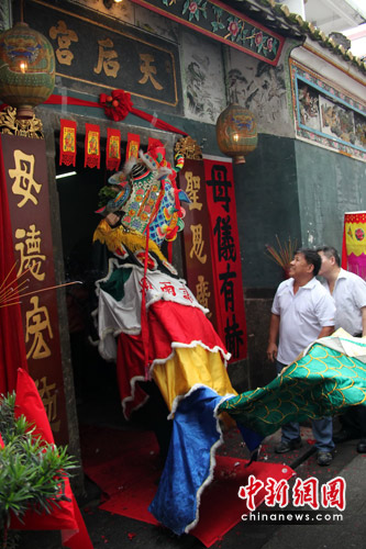 上午9點半,沙欄嚇村的吳氏宗祠前,吳姓老人們在祠堂內向祖宗敬香。麒麟舞依然是主要的慶;顒印kS后,由兩頭矯健的麒麟帶隊,40多位吳氏村民組成的麒麟隊,連同他們吸引的大批村民和觀光客一同浩浩蕩蕩地繞村一周,為全村祈福迎祥。半個多小時后,游行隊伍在敲鑼打鼓和鞭炮齊鳴聲中抵達祭祀媽祖的天后宮。