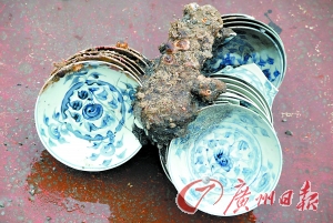記者了解到,古沉船經清淤后現身的3組木質隔艙板位于沉船中部,其中一塊已經現出約4米長的一段。隔艙板之間,已能夠清晰看到碼放整齊的一摞摞瓷器等文物。成摞瓷器基本上都是側立橫放并交錯碼放。考古隊員在水下見到的文物種類主要是青花瓷大盤,也有少量碗、缽、杯及金屬凝結物。而目前已出水文物主要類型也仍然是外銷瓷器青花瓷大盤、碗、缽、杯、罐、瓶等,此外還有釉陶罐、鐵鍋及銅板等。瓷器的主要產地確定為福建平和窯及江西景德鎮。
