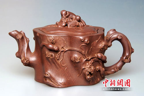 宜興紫砂與“世博”淵源頗深,歷史上曾多次參加世界性博覽會并獲大獎。記者現(xiàn)場看到,在歷屆國際性展覽中獲獎的6件珍品在展廳內(nèi)光彩耀目,其中在1910年“第一次南洋勸業(yè)會”上獲金獎的范大生“大柿子壺”、1915年美國巴拿馬國際賽會獲金獎的程壽珍“掇球壺”、1926年美國費(fèi)城藝術(shù)博覽會獲金質(zhì)獎的馮桂林“松鼠葡萄壺”等珍品引來眾多文化藝術(shù)界人士爭相一睹芳容。