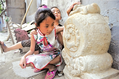 昨天下午,記者來到海淀區(qū)青龍橋街道騷子營社區(qū),石門墩就擺在李玉財家門外。石門墩高約50厘米、寬70厘米左右、厚度約20厘米,由整塊的石材雕刻而成,抱鼓上雕刻有精致的花紋。李玉財說,如果這個石門墩真是文物,他會立刻上交,“文物是國家的,要交給政府,好好保護起來”。