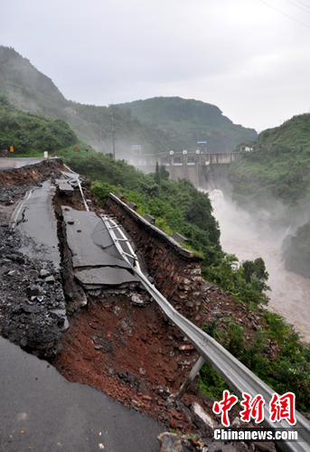 21日上午9時,120米長的路基深陷深度已達4—5米,其中25米路基和道路內(nèi)側臨時車道也垮塌,滑坡同時還引起上行線路出現(xiàn)裂縫,國道108線交通已完全中斷。該路段位于花灘電站水庫大壩下方、滎河河道正上方,地勢陡峭,一旦出現(xiàn)大面積塌方,泥石將直接滾入河道,很可能形成堰塞湖,后果不堪設想。