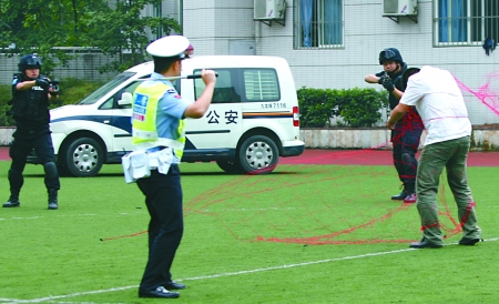 兩持刀男子沖進九龍坡區(qū)一小學,揮刀砍向攔阻他們的校園保安。正在危急時刻,端著沖鋒槍的飛龍突擊隊迅速出擊,兩張由網槍射出的紅色大網從天而降,將兩名男子圍住。5分鐘后,兩名持刀男子被擒獲。昨日下午,九龍坡區(qū)公安分局在天寶實驗學校進行了“飛龍2號”校園暴力事件處置演練。