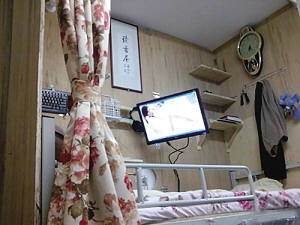從論壇發(fā)布的照片上可以看到,三張木板及花色窗簾構(gòu)造了一個豐富的私人空間(圖一)。內(nèi)有照明、電腦及空氣循環(huán)設(shè)備,可伸縮的電腦屏幕和可隨時收合的寫字臺,鍵盤、鼠標(biāo)和耳機(jī)掛在墻上(圖二),使用的時候只要旋動一個旋鈕,東西就可以拿下來在任何地點(diǎn)使用。這個狹小的空間內(nèi)還有三層木架,可放生活用品(圖三)。最吸引人注目的是該男生還在床頭掛了一幅墨寶——“讀書屋”。給人的總體感覺是,這是一個富有創(chuàng)意又勤奮好學(xué)的學(xué)生。