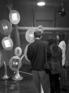 時間可以捕捉嗎?不斷流動的時間如何直觀地表現?一件名為“時間之樹”的作品讓人切身體會到“光陰易逝”、“時不我待”,這件作品用顯示屏同時展示一系列與時間有關的影像,在這里時間被瞬間加速,時間數字和不同時間段的同一場景在這些鏡形顯示屏上交錯呈現,讓人頓生緊迫感。