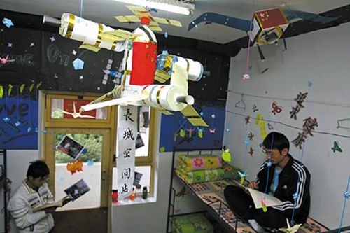 據(jù)了解,設(shè)計(jì)出這個(gè)寢室的是西南大學(xué)2008級植物保護(hù)學(xué)院的6名男生,這6人清一色的都是航天迷,家里關(guān)于宇宙、航天之類的書籍和影像資料幾乎可以堆成山。其中黃貴強(qiáng)更可謂入迷至極,他不僅對“神舟飛船”宇航員的各種小秘聞了如指掌,更對飛船的各個(gè)部件有著一定的研究,最大的愿望是成為一名航天員。為此,他還專門整理出所學(xué)知識(shí),將其貼在寢室門口。