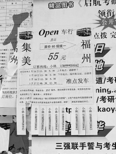 昨日(1月15日),記者走訪廈門幾所高校發現,在學校餐廳、宿舍樓、廣告信息欄等多處地方都貼了很多包車業務的小廣告,大部分留下的都是校內學生的聯系電話,目的地一般是福州、三明、南平等地。記者從包車廣告上看到,每天最少有兩個車次,最多高達4個。