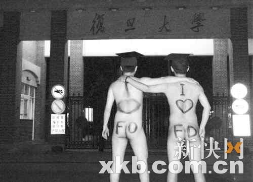 昨日,一條名為《復旦學生裸奔慶祝畢業》的圖文帖,火遍貓撲、天涯、華聲、網易等論壇。在貼出的圖片中,兩名男生頭戴學士帽,裸體在復旦校園內奔走,并在學校大門、校訓等多個地方留影。在網帖中,發帖者并未對兩名男生作介紹,但從其中一名男生在復旦的“恒隆物理樓”留影來看,網友們認為這兩名男生應該是復旦物理系的畢業生。