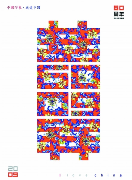 為迎接新中國60周年華誕,該校包裝系教授陳瞻最近特意設計了這一款海報,其最大的特點遠看是“囍”,近看又能凸顯出09和60兩個具體的主題,花紋和色彩設計烘托出喜慶氣氛。