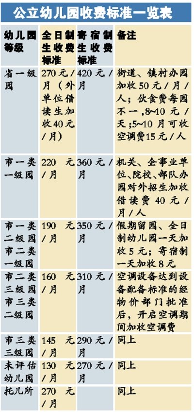 據(jù)介紹,公立幼兒園是屬于全市收費(fèi)最規(guī)范的層次,因?yàn)榘次飪r(jià)局規(guī)定,省一級(jí)、市一類園、市二類園、市三類園和未評(píng)估的幼兒園、托兒所,都有明確的收費(fèi)標(biāo)準(zhǔn)。公立園的每項(xiàng)收費(fèi)、標(biāo)準(zhǔn)及收費(fèi)許可證都須公示在公布欄。不過(guò),這一層次也是目前全市幼兒園中最少的。