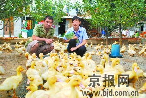 新近上崗的大學生村官在為鴨農做信貸調查。