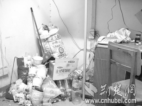 據記者了解,B棟所住的均為該校的男大學生。這行粉筆字寫在樓道的地上,記者趕到時,字跡已經十分模糊了。在知情學生的指引下,記者進入6樓一間寢室。一進門,一陣怪味就撲面而來。四下仔細一看,寢室門后一個高近一米的垃圾堆赫然出現在記者眼前:用過的飯盒、塑料袋,甚至是煙頭、飲料瓶,各式垃圾堆滿一地。但在這種環境下,寢室里的4個男生卻好像絲毫沒有察覺,上網、看書不亦樂乎。該寢室學生小程告訴記者,他們每天的學習任務都比較重,課余時間一些同學又流連網絡,因此大家平時都不愿意做清潔,寢室里形成這么個垃圾堆也“不足為奇”。“不過通常我們隔一個月會清除一次的!毙〕陶f,冬天把垃圾堆在寢室里也沒多大關系,夏天會清除得比較及時。而小程所說的“清除”,就是把垃圾從室內掃到寢室門口堆放,等宿管做清潔的時候一并清理。“其實我們的生活垃圾是應該自己拿到樓下的垃圾桶里扔掉的,但很多同學為了省事,就直接把垃圾堆在門口,這樣增加了宿管做清潔的勞動量,最后才發生了她們寫‘大字’抱怨的事情!