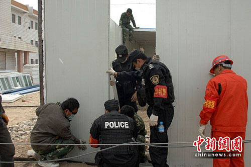 當天下午,由成都公安特警30名青年民警組成的突擊隊與建材集團員工一起先用挖土機將地面推平,然后隊員們分工合作、用帶來的發(fā)電機迅速發(fā)電,有的切割泡沫板,有的在鋼板上鉆孔,有的拼接泡沫墻面,在“5.12”抗震救災時掌握的“施工技術”在這兒全用上了。這時的天空又一次飄起了雨夾雪,寒氣襲人,但特警隊員們仍然干勁十足。由于高原缺氧,一名隊員在劇烈搬送后出現(xiàn)了頭暈癥狀,其他隊員馬上將他扶到一旁休息,另一名隊員立即替補上去,他們就這樣輪番著作戰(zhàn)。在拼接板墻的時候,由于風沙很大,隊員們眼睛、嘴里全是沙,但他們顧不了那么多,心中只有一個信念:就是以最快速度將板房建好,讓災區(qū)的同學們早日復課,參加學習。