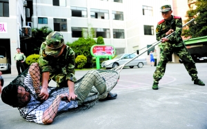 昨日,福建泉州邊防支隊官兵展示研制出的“網罩棍”。該武器將推廣到當地學校的保衛室使用。林良標 攝