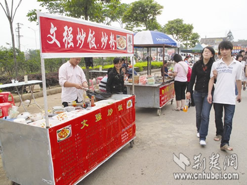 荊楚網(wǎng)消息 (楚天金報) 記者邵娟 通訊員劉磊報道:“文強炒飯?文強不是重慶的貪官嗎?老板竟用這種噱頭吸引顧客?”日前,武漢科技大學(xué)校門前一家名為“文強炒飯”的攤位,雖然吸引了過往大學(xué)生的眼球,但因被認為是店主找的“噱頭”,所以生意并不好。