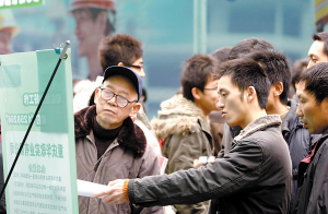 農(nóng)民工專場(chǎng)招聘會(huì),吸引了不少應(yīng)屆大學(xué)畢業(yè)生前來(lái)應(yīng)聘。他們對(duì)第一份工作的月薪期望,在1000元左右,與不少有一技之長(zhǎng)的農(nóng)民工相比,少了一半。