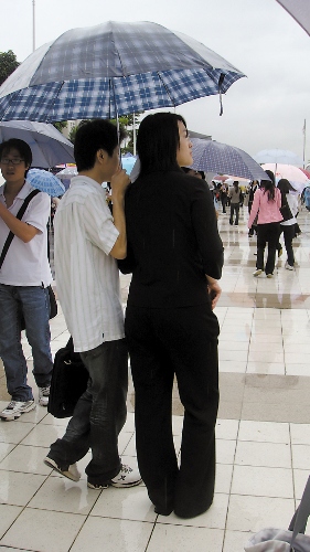 招聘會現場,男士為女士遮風擋雨 黃玉杰 攝