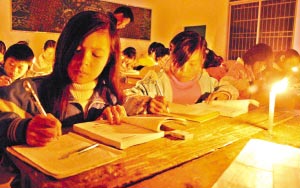 昨天(19日)下午6時(shí)40分,16歲的陳麗娟與同學(xué)們照例走入課室,從老師手中接過(guò)一支蠟燭點(diǎn)燃,當(dāng)晚,連州市西江鎮(zhèn)中學(xué)600多學(xué)生在點(diǎn)點(diǎn)燭光中,迎來(lái)了2008年新學(xué)期的第一個(gè)晚自修。