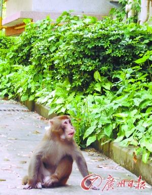 廣東外語(yǔ)外貿(mào)大學(xué)校園東北角是幾棟教工宿舍,隔著圍墻,外面就是郁郁蔥蔥的白云山。“大概5天前,我看到墻頭上蹲著一只猴子,就回屋拿香蕉過來逗它。它盯著香蕉,又看了我?guī)籽郏罅锵聡鷫μ轿疑磉叄们白ε呐奈业耐取?此蓱z,也多少有點(diǎn)害怕,我把香蕉扔給它,它就自己剝開香蕉吃了。”住在這里的鄭叔告訴記者,這是一只成年猴,個(gè)子有70厘米左右,樣子很可憐,一點(diǎn)也不兇。“我在這里住了三十多年了,還頭一回看到猴子下山。”
