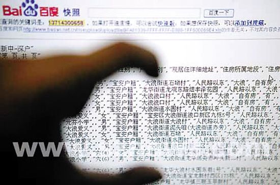 帶著滿腹疑問,沈女士某日晚間上網時嘗試用搜索引擎查找與自己手機號碼相關的信息。在“百度”上出現的搜索結果,其子小圳的姓名、學校、班別、性別、詳細住址與家長聯系電話便一覽無余。再打開“鏈接”,一個名為“××中學2008年××××錄取名單”的表格便出現在網頁上,讓她吃驚的是,按照表格上的分類,除了之前所看到的信息外,甚至還有該學生是否屬于獨生子女、家中是否擁有房產等資料。