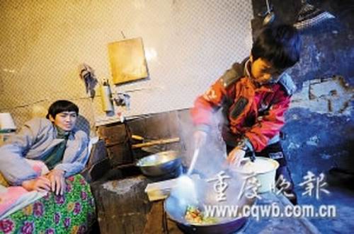 昨日(11月13日),記者在彭小林那幢土房里看到,這個家所有家具就是兩張床、一張桌子,一臺爸爸受傷前買的彩電是家里唯一的電器。家雖破舊,但整潔干凈。彭花權的床頭就是水龍頭和下水道,床上放著一根兩米長的竹竿,一頭裝著個鐵鉤,彭花權可躺在床上用它“拿”東西。家里的桌子、爐子腳下都安有輪子,不用費多大勁就能鉤到床邊。這些都是父子倆改裝的。