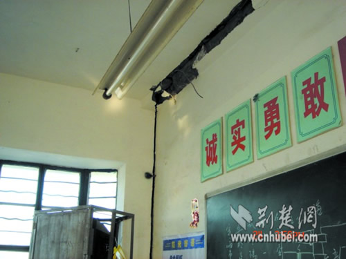 昨日下午,記者在潛江實驗小學看到,北教學大樓已經人去樓空。有的教室墻壁上的裂縫可以插進手掌,有的教室天花板上的涂料全部脫落。