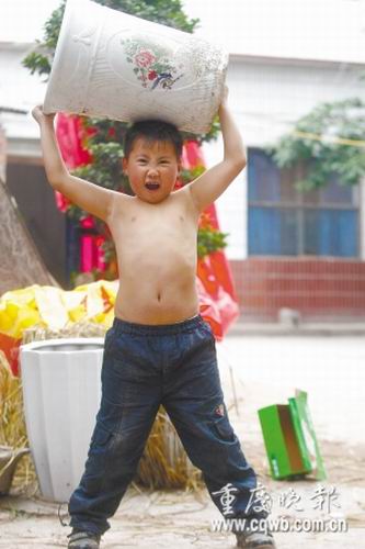 開縣有個6歲男童,他1歲零4個月時,就提起了5公斤重的東西;5歲時,背起了70多公斤重的母親;現(xiàn)在,更是輕松背起了體重93.5公斤的大人……在當(dāng)?shù)兀袀雅號,叫“小小大力士”。