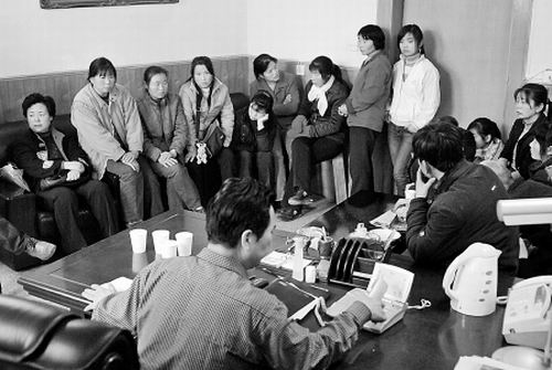 職工們圍坐在馬院長辦公室討要工資。記者 翟小雪 攝