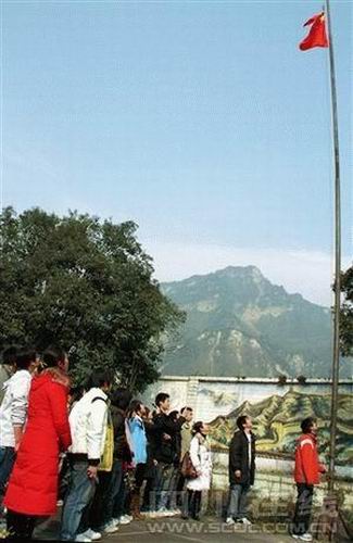 在漢旺東汽中學(xué)操場(chǎng)上,堆滿了一堆廢墟。在學(xué)校圍墻正中央,是一幅2米多寬的萬里長(zhǎng)城的國(guó)畫。國(guó)畫前,一面國(guó)旗在風(fēng)中飄揚(yáng)。“同學(xué)們,我們一起在這里,舉行一個(gè)升國(guó)旗儀式,怎么樣?”鄧?yán)蚶蠋煹慕ㄗh很快得到了同學(xué)們的贊同。同學(xué)們不約而同地站在國(guó)旗前,一只手緊貼著胸膛,對(duì)著國(guó)旗行注目禮。這時(shí),黃沛和茍明強(qiáng)兩位同學(xué)站在國(guó)旗下。黃沛雙手輕輕抓住升旗的繩子,茍明強(qiáng)右手抓住國(guó)旗的右上角,順風(fēng)放手。11:08,在丁楠杰的領(lǐng)唱下,同學(xué)們像往常一樣,站在旗桿下,用哽咽的聲音斷斷續(xù)續(xù)地唱著國(guó)歌,看著國(guó)旗緩緩升向天空,許多同學(xué)激動(dòng)得一時(shí)很難再往下唱。