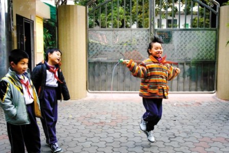 ↑上學期末,廣州市中山路某小學,早到的孩子在緊閉的校門前跳繩等待   本報記者   何奔 攝