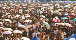 有了前兩天的經(jīng)驗,許多女生帶了拖鞋和折疊凳來(它們和遮陽傘一起被稱為“求職三寶”),管它和筆挺的西裝配不配。等到快到自己了,再換上高跟鞋,又是漂亮的“準白領(lǐng)麗人”。夏楊、陳輝、余蓉蓉、方瑋