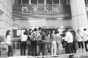 中國證券報記者在檔案大廈四樓業務大廳看到,一間100平方米左右的房間開設了7個服務窗口,每個窗口前都擠滿了人。而在檔案大廈外面,沒能排到號的市民遲遲不愿離去,任憑保安反復解釋,人群仍是相當激動。