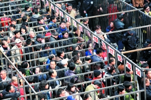 不過,在這種搶字當頭的時刻,也有一些讓人感動的細節。家住西門路口的劉大爺今年83歲,家中只有他和老伴。為了趕上這場置換房簽約,昨天早晨6點多,老人就出發了,從家一步步地挪到農招大酒店。來之前,老人想自己肯定算早的,但到了簽約地點,才發現隊伍都快排出了大院。正在劉大爺不知所措時,一些年輕居民紛紛往一邊靠去,給老人讓出一條道,還有的小伙找到執勤的保安,讓他們攙扶著老人優先進入簽約大廳。而這一切,幾乎都是在一種默契下完成。