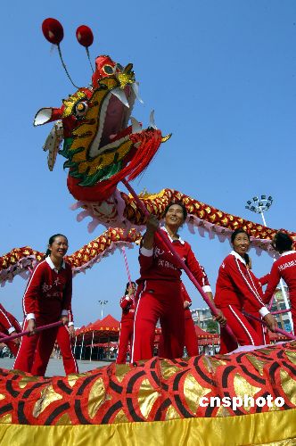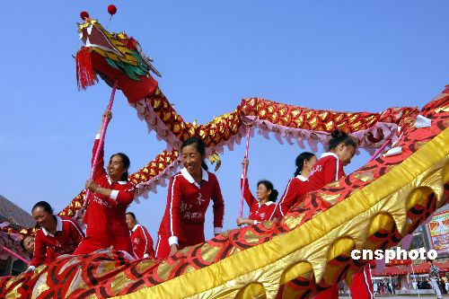 2007年10月20日,在安徽省亳州市萬福廣場,一支女子舞龍隊的隊員正在進行舞龍表演,為在這里舉行的為期兩天的亳州市首屆“萬福”老人節助興。中新社發 張延林 攝