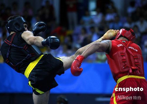 8月23日下午,在北京2008武術比賽男子散手70公斤級較量中,伊朗選手侯賽因·奧賈吉(黑方)戰(zhàn)勝巴西選手埃默松·諾蓋拉·阿爾梅達(紅方)。中新社發(fā) 宋吉河 攝