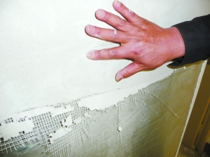昨日,韓先生向記者展示輕易就能扯掉的墻面
