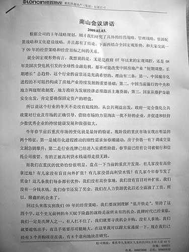 昨日,重慶一網友自稱貼出隆鑫地產一份高層內部南山會議講話稿的照片,其稱在春節后,隆鑫地產欲對旗下樓盤降價,以期快速回籠資金去買地擴張規模。從內容上看,講話者像是為隆鑫降價做動員工作,表明降價的目的是快速回籠資金并擴大規模。網友在跟帖中稱,萬科松山湖會議紀要事件驚現重慶版,隆鑫降價講話遭網絡泄密。隆鑫地產一位不愿意透露姓名的高層告訴記者,內部正在追查泄密者。