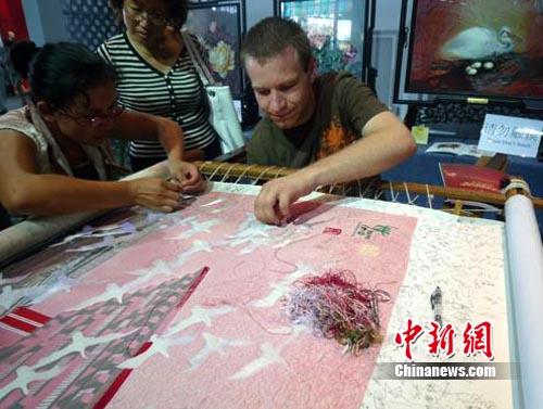 中新網上海7月20日電(肖前輝 劉吉科)入駐上海世博園寶鋼大舞臺“中國元素活動區”傳習區表演半個月以來,湘繡以其神奇的針法和快樂的參與性受到世博游客的熱捧。截至7月20日,已有來自世界各地的上千名觀眾參與了刺繡。