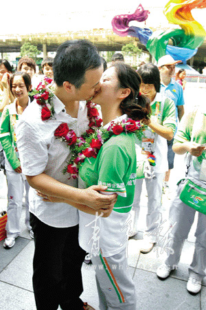 編號(hào):20108161314。兩位新人從園區(qū)志愿者部部長(zhǎng)夏科家手上接過了獨(dú)一無(wú)二的世博結(jié)婚證。這個(gè)編號(hào)不但是對(duì)他們婚禮吉時(shí)的記錄,也是對(duì)他們幸福生活的美好祝福。“親一個(gè)!親一個(gè)!”圍在新人周圍的99位“小白菜”可不會(huì)輕易放過這位和自己朝夕相處的老師,開始起哄。大庭廣眾之下,施諾哪好意思,對(duì)著新娘的額頭就是一下蜻蜓點(diǎn)水,想要糊弄過關(guān)。“不算!不算!”聲音越來越響,不少游客也忍不住駐足觀望。迫于“群眾壓力”,兩人在七彩之心下深情一吻,接受所有人的祝福。