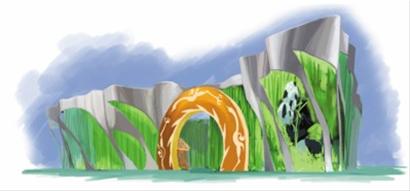 進入拱門,參觀者將遇見歡迎八方來賓的大熊貓“歡歡”。通過多媒體播放,這位迎賓者傳遞出四川人民的熱情。 “歡歡”也是人們整個參觀過程中的導游,會在各個展區的多媒體視頻上出現。