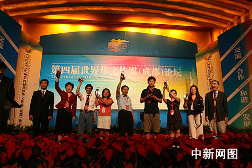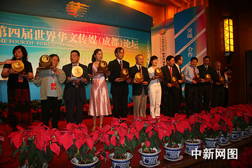 [主持人]: 獲得傳媒機構貢獻獎的有:美國僑報、新加坡聯合早報、香港鳳凰衛視