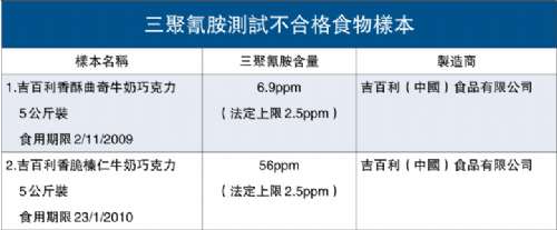 吉百利香脆榛仁牛奶巧克力的三聚氰胺含量為百萬分之五十六,較法定上限的百萬分之二點(diǎn)五,超出二十一點(diǎn)四倍;另一款吉百利香酥曲奇牛奶巧克力三聚氰胺含量為百萬分之六點(diǎn)九,超標(biāo)一點(diǎn)七六倍。