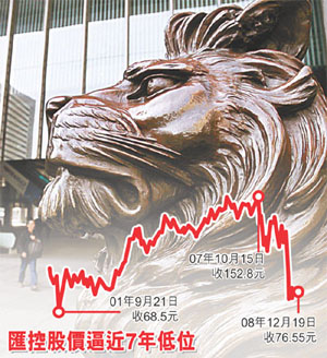 中新網12月22日電 香港《文匯報》今日在要聞版報道,大笨象匯控沽壓未完,該股在美國的預托證券曾一度跌逾8%,低見69.5元,收市折合價為70.6元,雖險守70元關口,但仍較港股上周五收市大跌7.7%,故市場人士預期,今日匯控在香港可能會重現11月時低位,即74.75元。至于油價回落,也拖累石油石化類股份表現,中海油及中石油分別跌2.5%及0.57%,所以今日恒指可能會大幅低開逾300點。
